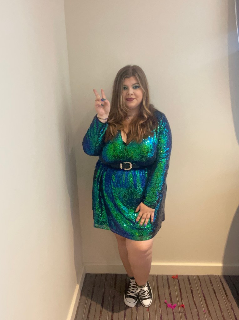 Tonight’s theme was blue and green and oh hell did we take this theme and run with it. I loved this outfit so much but it was safe to say the face sparkles did not last anywhere near as long as we had hoped.