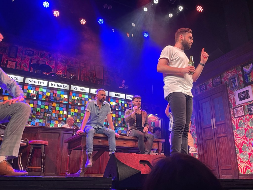 The moment you walk into the theatre (the arts theatre in the west end), you’re greeted by a set that’s straight out of your favorite local pub. Not only does it look and feel like a traditional local… IT HAS A WORKING BAR. It’s warm, inviting, and the perfect setting for what’s to come.